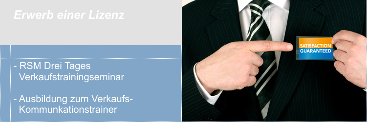 1. Das angebotene Programm RSM Grundlagen - Verkaufstrainingsseminar inkl. die auf diese Themen und Inhalte abgestimmte, intensive Vermittlung des Hintergrundwissens sowie die Präsentation Ihres dann eigenen Seminarskripts und das Trainerhandbuch versetzen Sie in die Lage, das im RSM Grundlagen - Verkaufstrainingsseminar erworbene Wissen sofort im Markt umzusetzen. Sie erwerben damit ein über 20 Jahre ausgereiftes Geschäftsfeld.